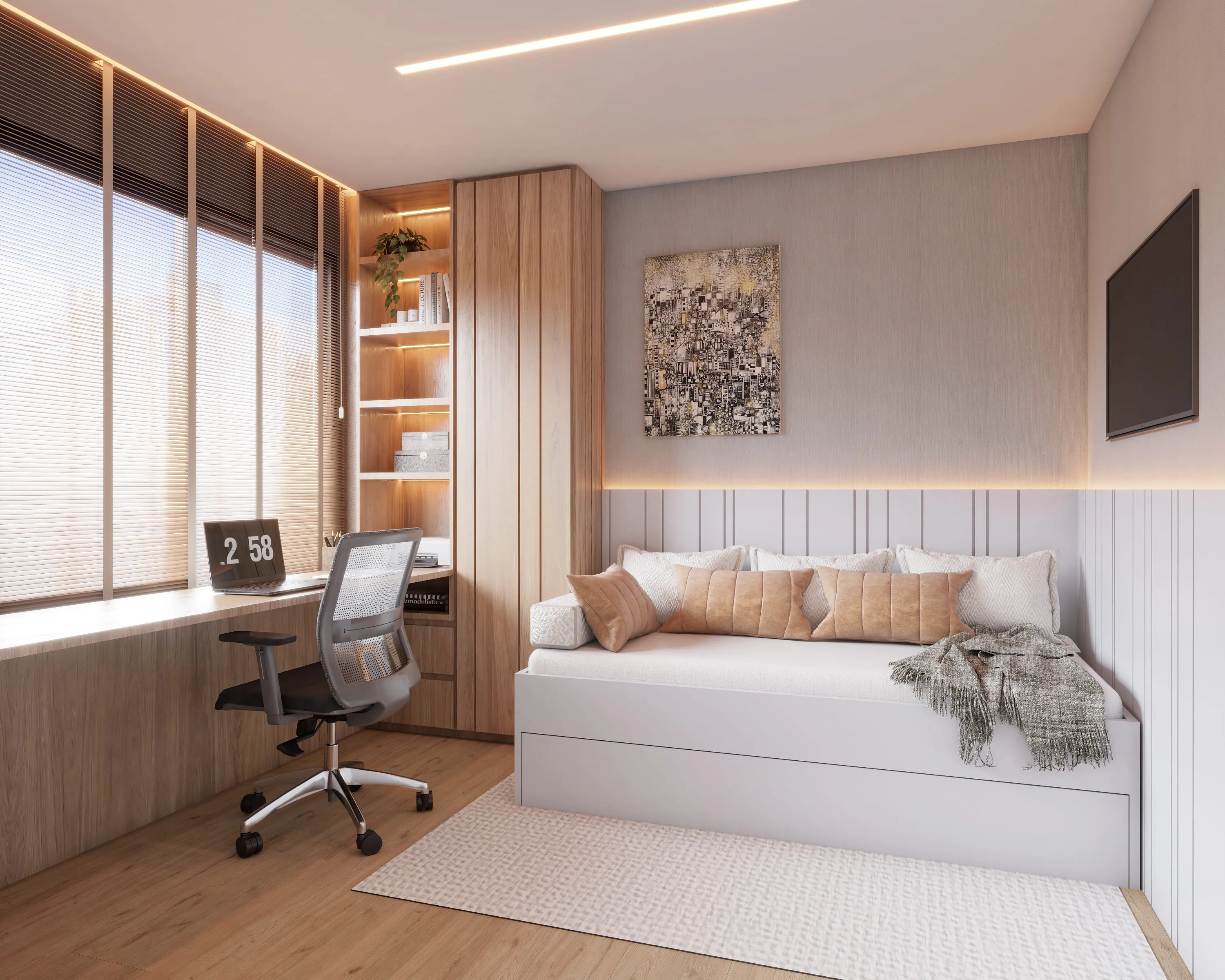 Quando bem integrado ao projeto, esse espaço passa a dialogar naturalmente com a arquitetura da residência, com proporções equilibradas, privacidade e uma atmosfera adequada para momentos de concentração. O resultado é um ambiente que funciona com fluidez dentro da rotina da casa, sem parecer um elemento isolado ou provisório.